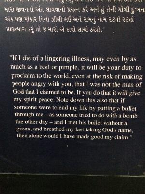 "If I die of a lingering illness, may even by as much as a boil or pimple, it will be your duty to proclaim to the world, even at the risk of making people angry with you, that I was not the man of God that I claimed to be. If you do that it will give my spirit peace. Note down this also that if someone were to end my life by putting a bullet through me - as someone tried to do with a bomb the other day - and I met his bullet without a groan, and breathed my last taking God's name, then alone would I have made good my claim."