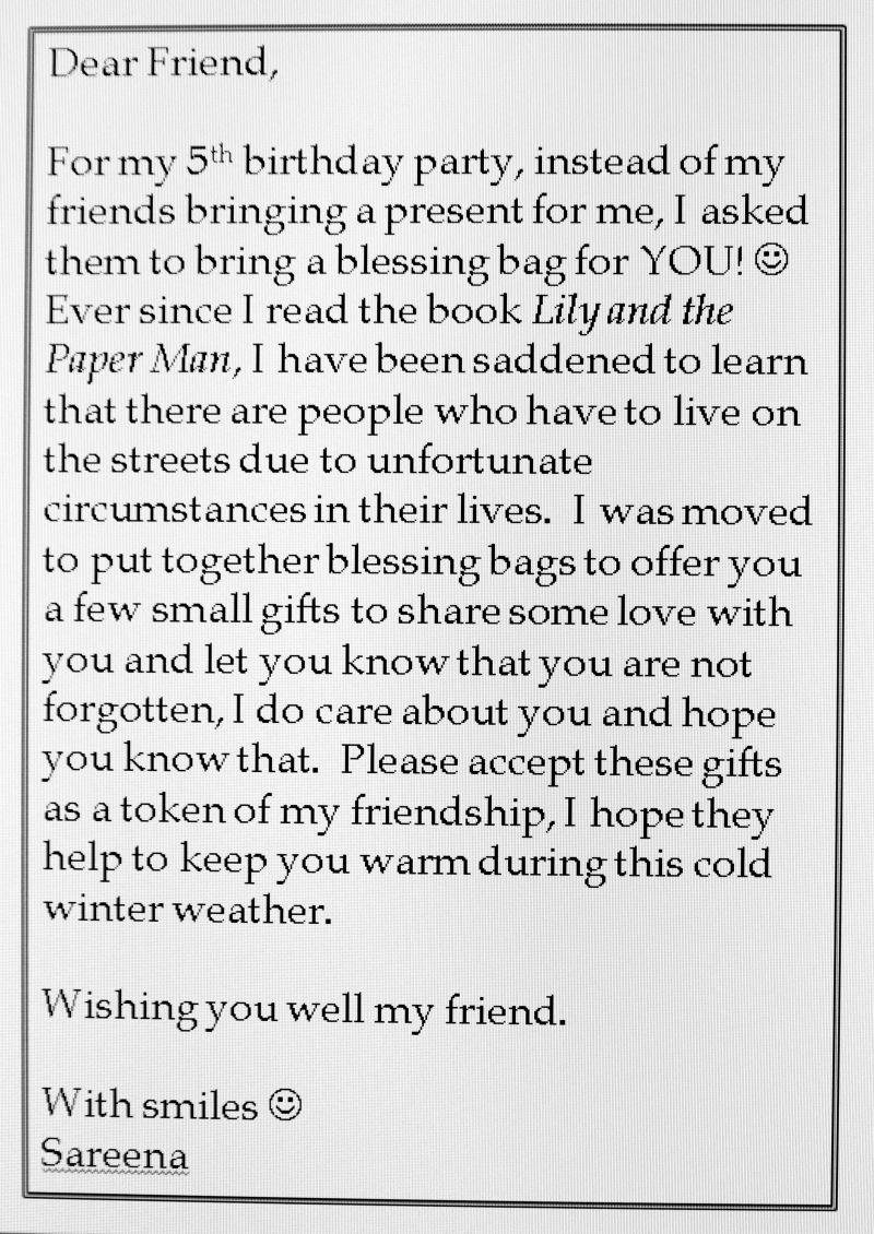This past week Sareena and I volunteered on a Thursday evening at the “Hosting the Homeless” programme that is run at a local church hall in our neighbourhood. This church hall also happens to be the exact place where we celebrated Sareena’s 4th birthday last year and that’s how we came to know about this project. Sareena was very excited about sharing the blessing bags and also curious as to know who she would be giving them to, what they would be like and how they might respond when they received the bags. Before we packed up the car with nearly 30 blessing bags, we placed a little letter inside each of the blessing bags. In this letter, we shared the story of how those blessing bags came to be and why Sareena was moved to gift them so that the guests who received them would know about the chain of love and kindness that led to them receiving the blessing bags.