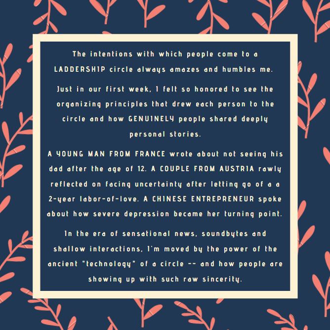 "The intentions with which people come to a Laddership circle always amazes and humbles me. Just in our first week, I felt so honored to see the organizing principles that drew each person to the circle and how genuinely people shared deeply personal stories. A young man from France wrote about not seeing his dad after the age of 12. A couple from Austria rawly reflected on facing uncertainty after letting go of a a 2-year labor-of-love. A Chinese entrepreneur spoke about how severe depression became her turning point. In the era of sensational news, soundbytes and shallow interactions, I'm moved by the power of the ancient "technology" of a circle -- and how people are showing up with such raw sincerity."